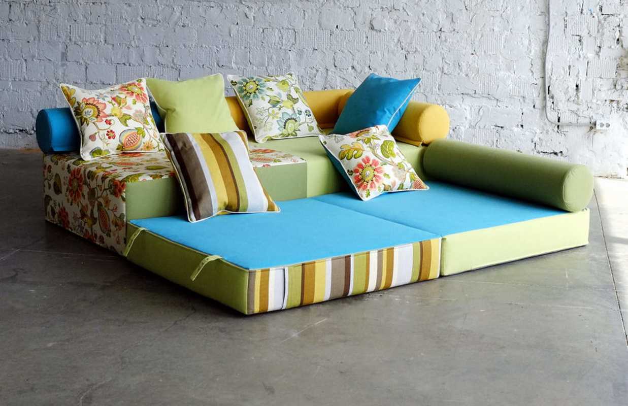 - З м’яких блоків. Дивани відносять до трансформерам. Їх випускають у вигляді окремих блоків, які переставляються в залежності від потреб власника або особливостей інтер’єру. Велику модель можна розібрати на окремі крісла, використовувати один з блоків в якості столу. Дивани з м’яких блоків розташовують в чіл-аут-зонах, в заміських будинках.