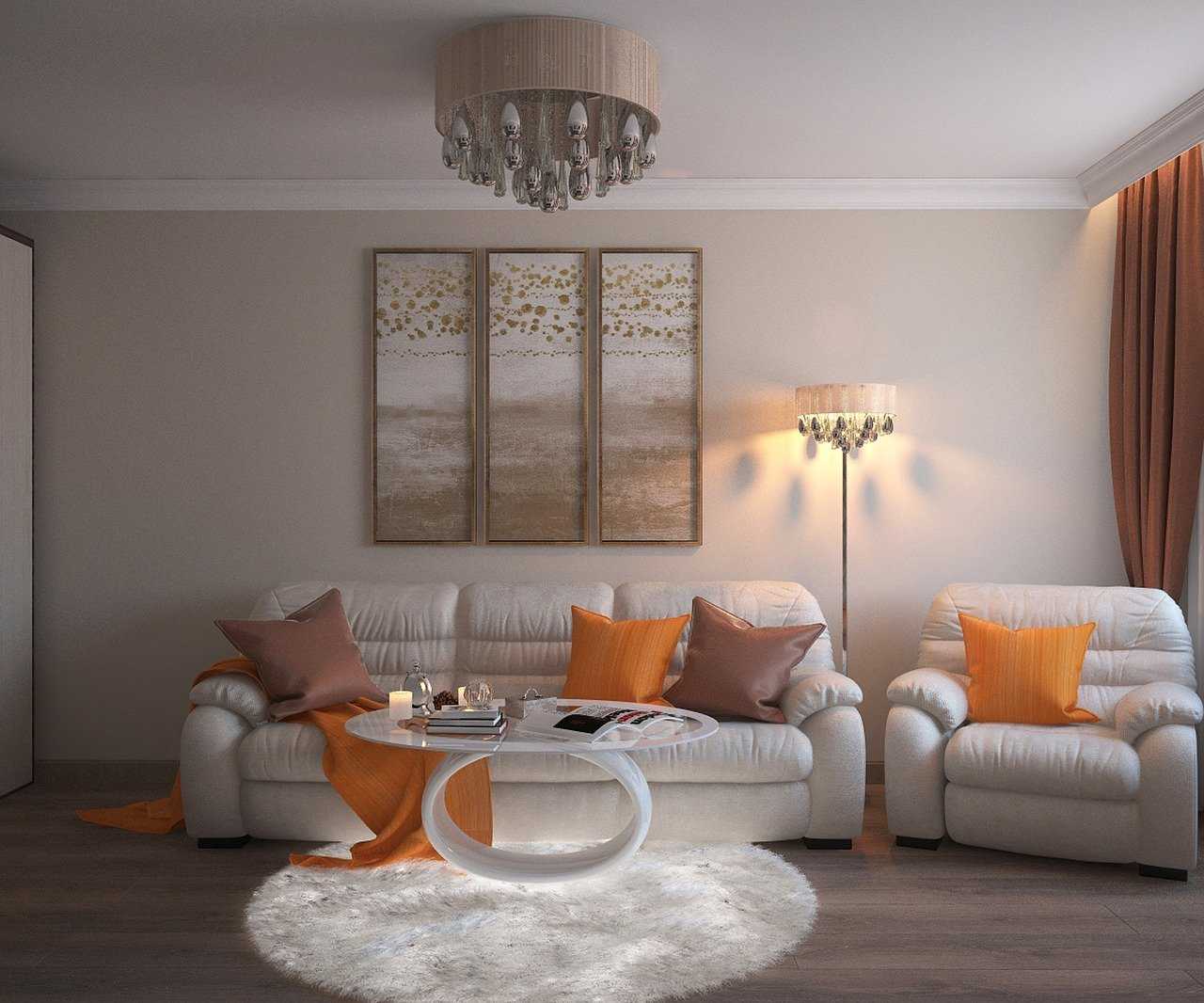 На фото компактная гостиная. Дизайн дополнен яркими деталями оранжевого цвета.