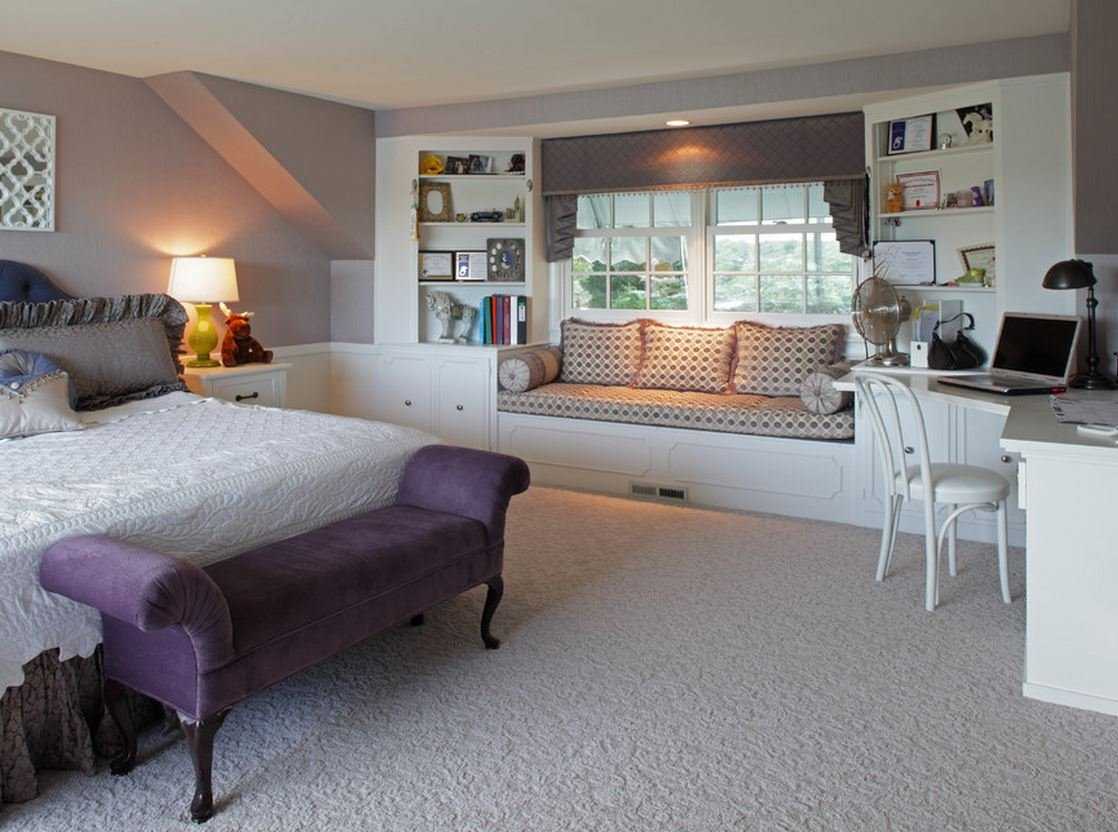 Для тех, кто любит в спальне посидеть с ноутбуком, найдется место для мини-кабинета с диваном. Его зонируют раздвижной перегородкой, шторой. Малогабаритный мягкий блок поместится сбоку от стола в нишу, образованную системой пристенных шкафов. Сюда же подводится неяркий свет, что создает атмосферу комфортного уединения.
