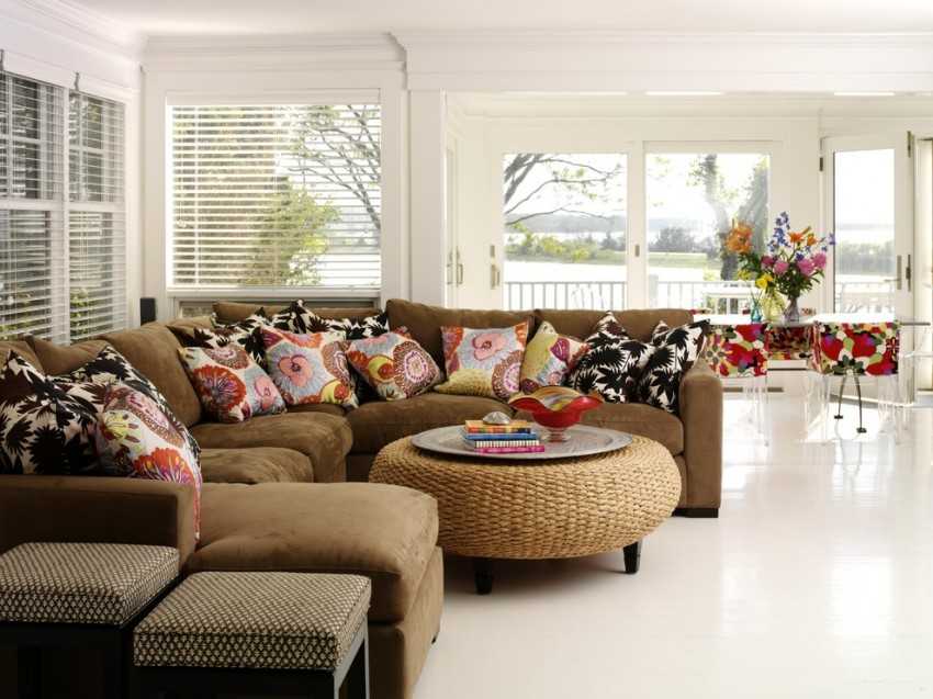 Когда эркер имеет многоугольную форму, то стоит уделить внимание модульной мебели. Конструкция состоит из нескольких блоков, поэтому владельцы дома смогут самостоятельно собрать диван с нужным количеством мест