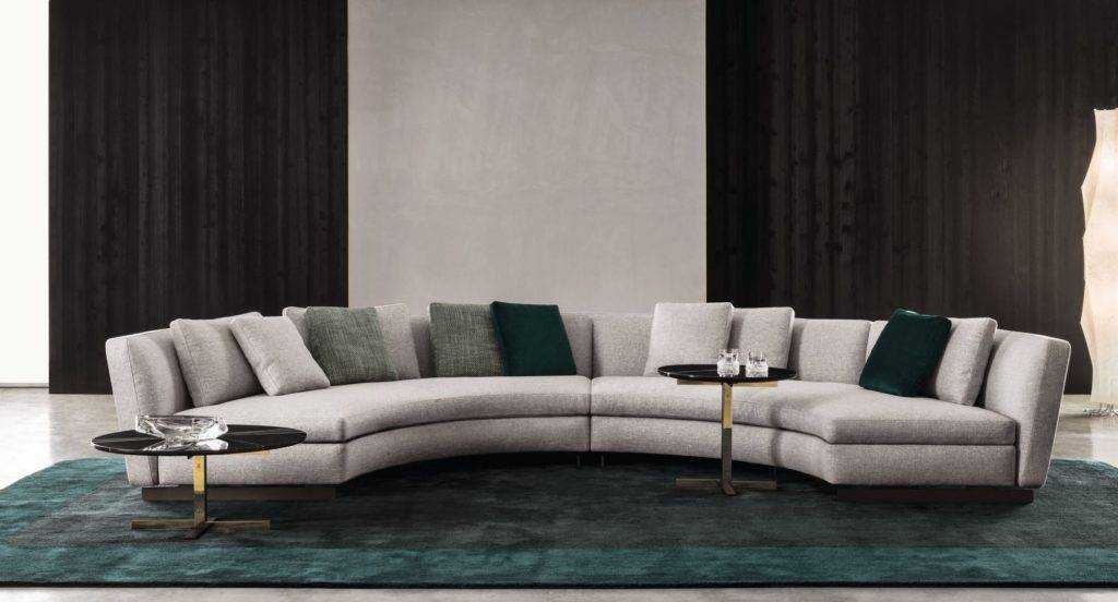 Рядом с таким диваном можно поставить журнальный столик, также повторяющий полукруглую форму. Спасет положение и полукруглое зеркало или такой же напольный ковер, благо, выбор их сейчас огромен на рынке. К сожалению, в простой квадратной квартире полукруглый диван может попросту визуально «потеряться», но и в данной ситуации умелый дизайнер придет вам на помощь.