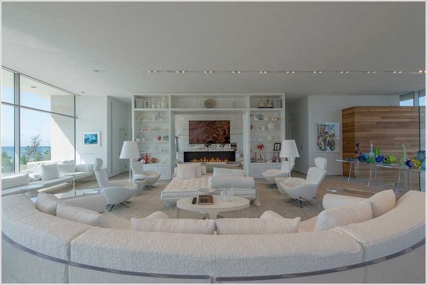 Интересным решением стало бы разделение вашего помещения на определенные зоны. Это может быть зона отдыха такой же формы – два эксклюзивных полукруглых дивана друг напротив друга, поставленных у камина или рядом с большой картиной. С помощью обтекаемых диванов легко можно отделить кухню от гостиной.