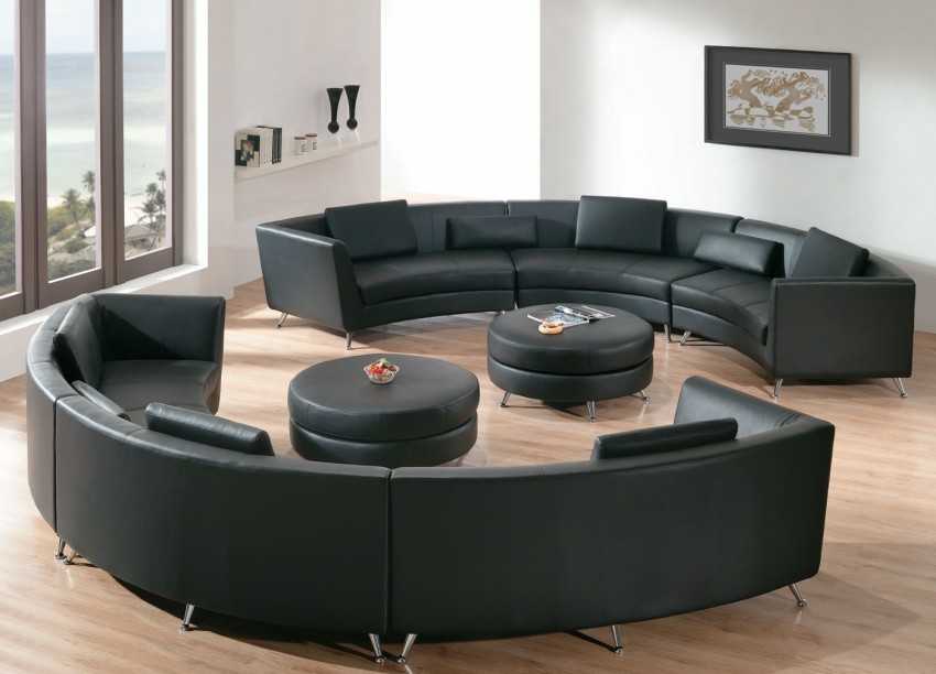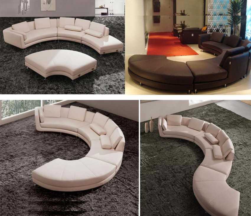 Натуральная кожа в качестве обивки – вариант недешёвый, подчёркивающий определенный статус владельца мебели. Кожаный полукруглый диван станет самым ярким пятном при любом дизайне.