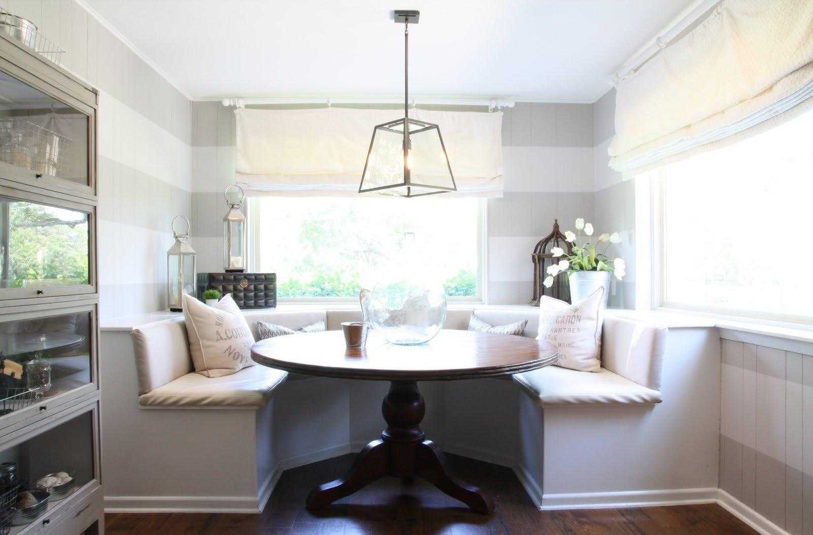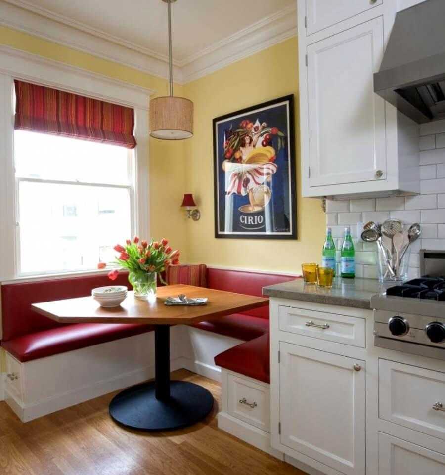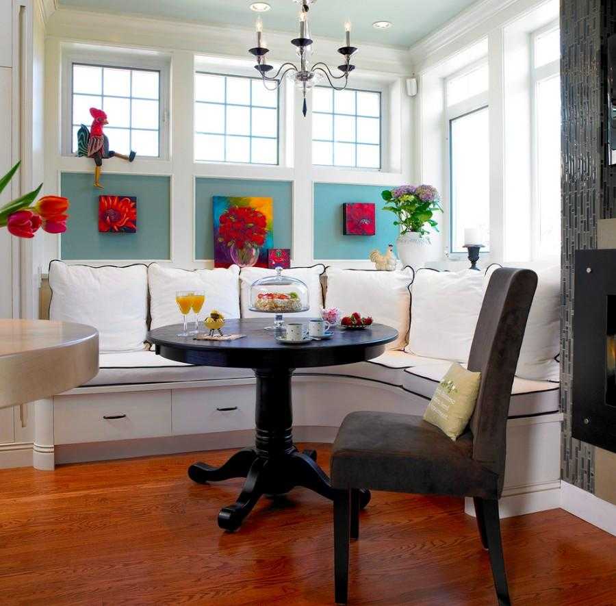 Комбинировать угловой диванчик очень удобно с креслом и столиком для чаепития.