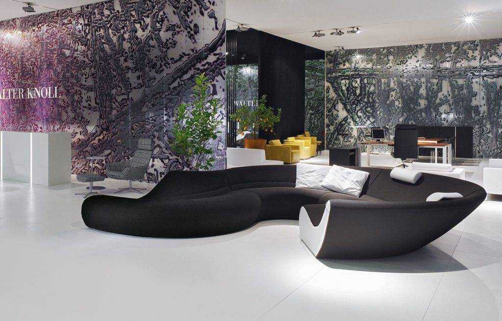Но над её расстановкой необходимо хорошо подумать, ведь вариантов может быть несколько. Изогнутая стена, вдоль которой размещена мебель изогнутой формы – это первое, что приходит в голову. Очевидно, что такой вариант имеет право на существование.