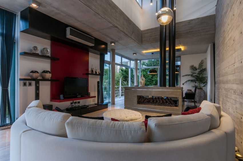 Композиционный центр в этом случае остаётся напротив и несколько в отдалении от дивана. Если это классический ретро интерьер, место полукруглого дивана будет, безусловно, у камина, а для урбанистического стиля самым правильным выбором будет зона у телевизора.