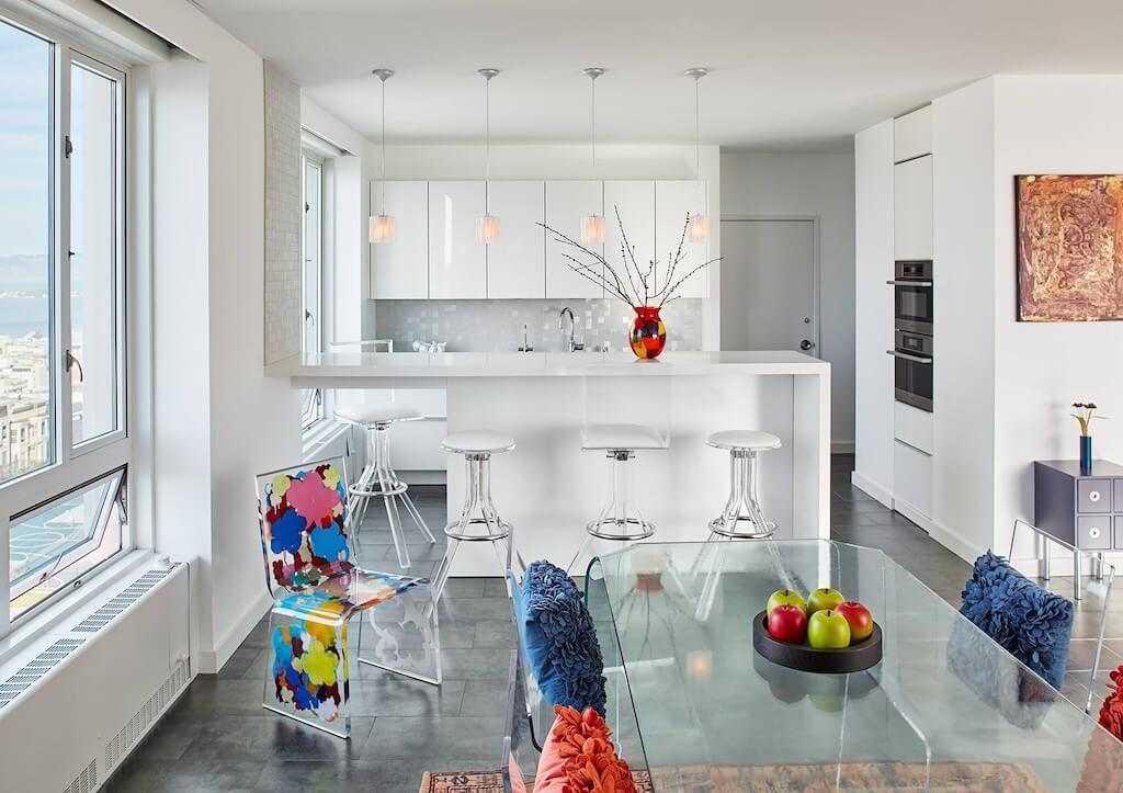 Стиль на 11-метровой кухне может совпадать с остальной квартирой или отличаться. Но вот мебель обязательно должна подбираться в соответствии с выбранным стилем. Например, для хай-тека будет уместно использование стеклянного стола и прозрачных стульев из акрила, а вот классический дизайн не допустит такой простоты.