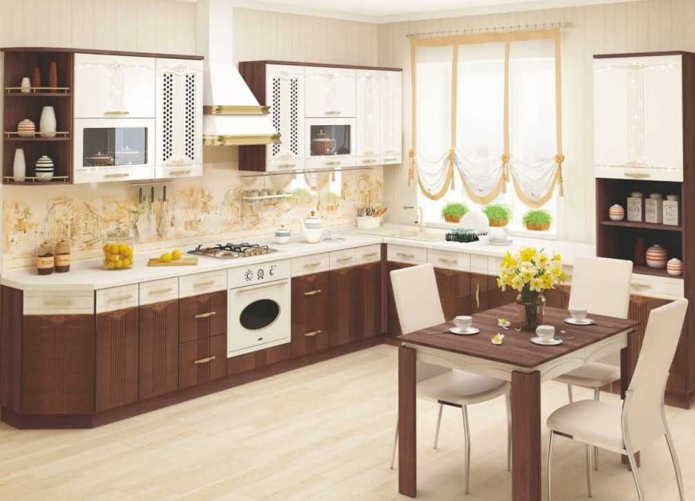 Г-образная или угловая компоновка подходит для дизайна интерьера узкой кухни 10 квадратов. Незанятая стена может быть украшена декоративным панно или мозаикой