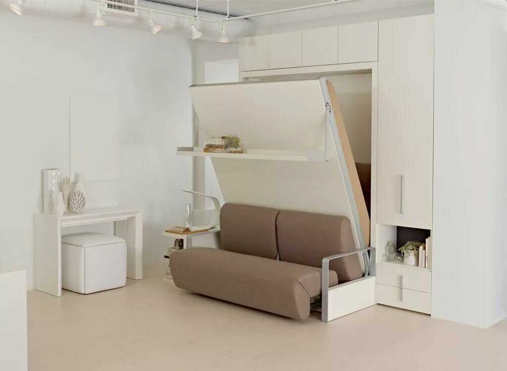 Также существуют раскладные шкафы диваны, которые просто опускаются из стеллажа над диваном. Стеллаж остается функциональным в любое время суток. Такой диван не заметен днем. Минус в том, что такая модель используется только для сна, так как убирается полностью, не давая возможности сидеть. Если в комнате есть дополнительный диван или кресло, то это хороший вариант. Но он не подойдет для гостиной, а для спальни очень удобен.