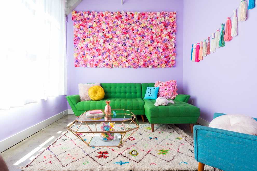 - Зеленый диван сочетается с голубым, синим, зеленым и серым.