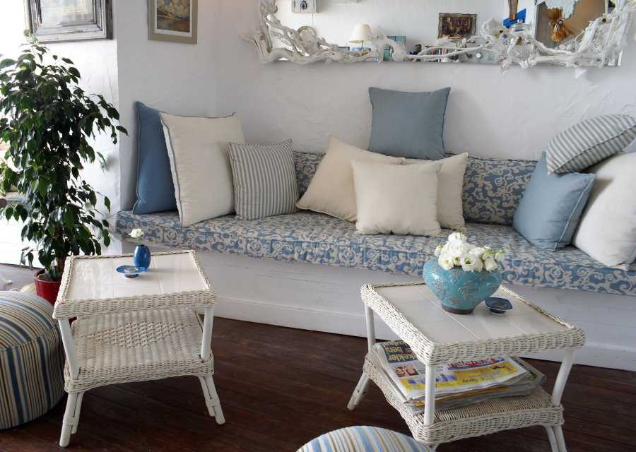 Красный диван с элементами синего подойдет для классического интерьера. Если добавить тематические декоративные элементы, то можно получить морской, восточный или стиль рустика.
