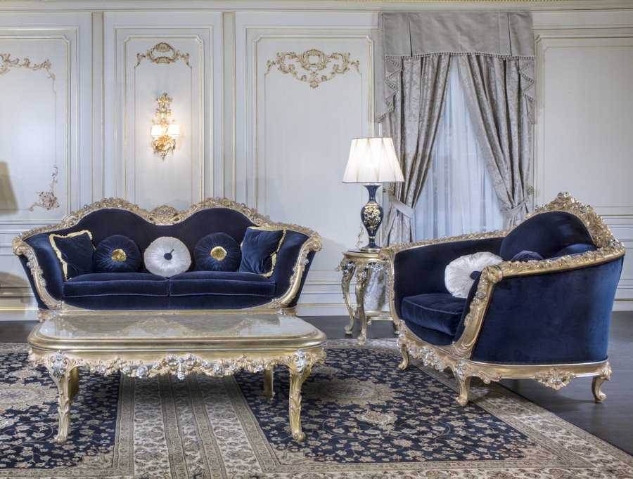 Синий цвет смотрится солидно, торжественно. Присуща строгость, праздность в элементах, великолепие. Цветовая гамма состоит из пурпурного, изумрудного, бронзового и золотого цветов. Пол отделывается паркетом или мрамором, на потолке лепнина с позолотой.