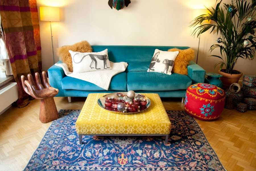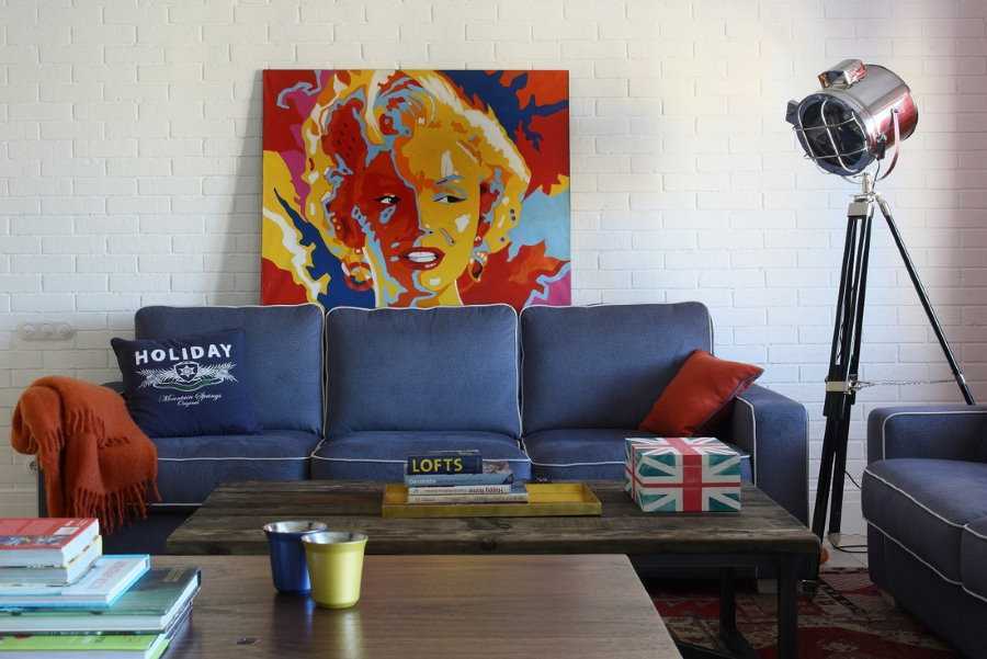Мягкая мебель синего цвета отлично уживается в ярком и эмоциональном интерьере