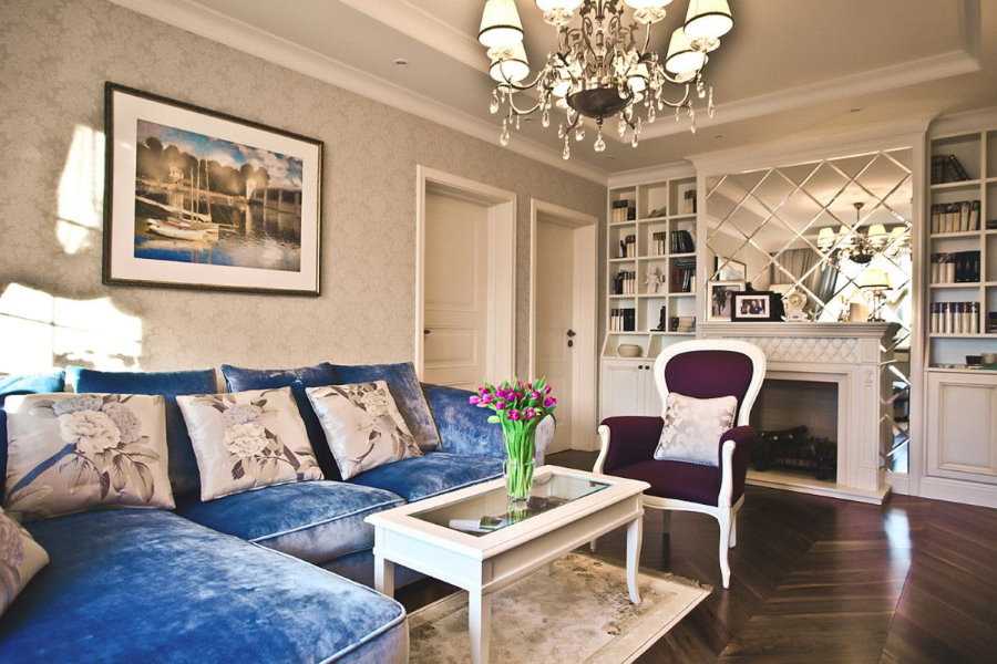 Синий диван в интерьере гостиной отлично сочетается с различными стилями