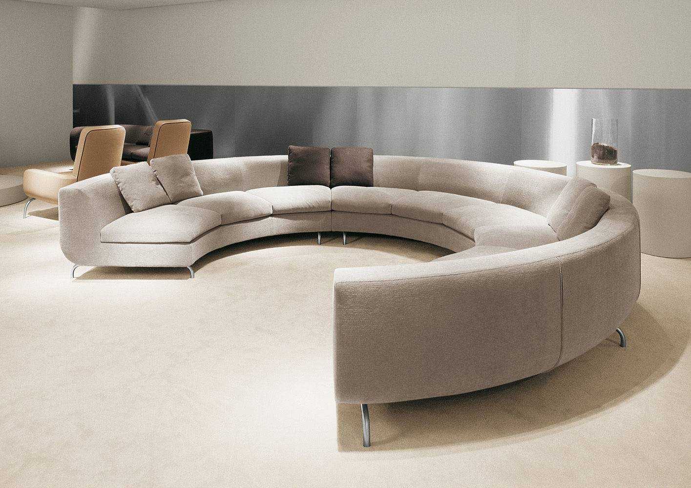 Полукруглые диваны – это редкие и оригинальные мебельные изделия. Они подходят для просторных комнат. С ними можно красиво обставить современный интерьер. Единственно, такие модели редко бывают раскладными.