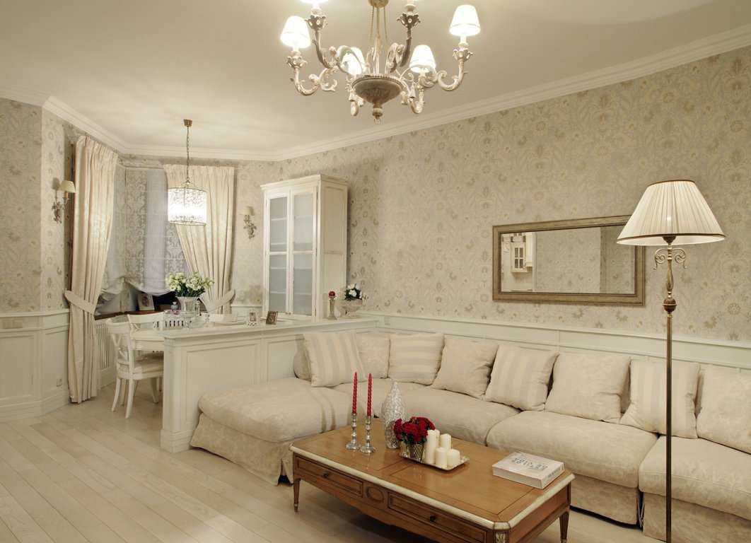 Классический стиль хороший выбор для семей с традиционным укладом. Для оформления гостиной эконом-класса используются светлые оттенки в качестве фона, а основной акцент идёт на декоре. Это может быть имитация лепнины, настенные часы, картины, декоративные подсвечники, шторы с драпировкой и пр. Для напольного покрытия популярен паркет. Дорогие паркетные доски можно заменить ламинатом или линолеум с паркетным рисунком. Экономичный вариант для мебели — с МДФ с покрытием, повторяющим фактуру древесины.