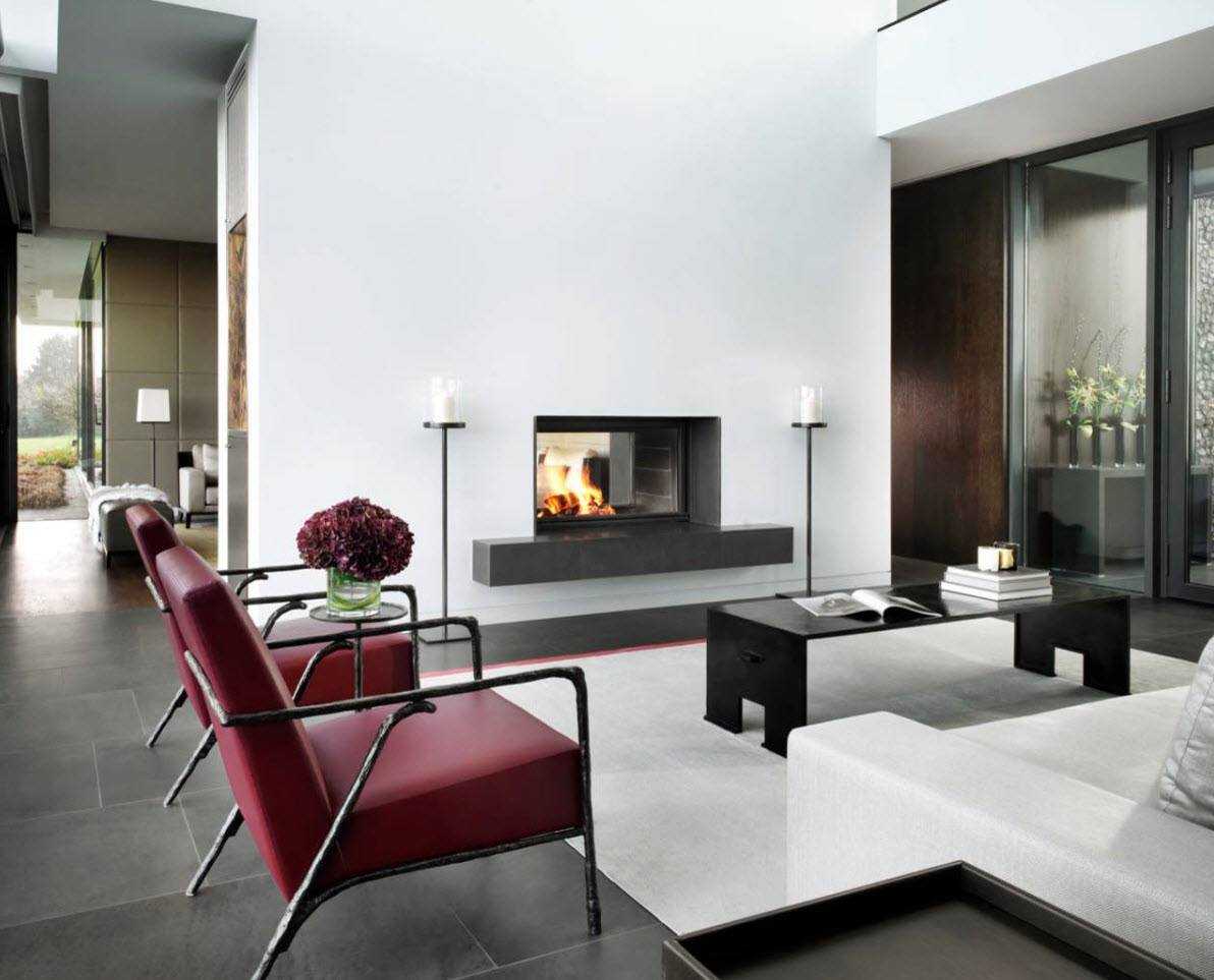 В минимализме доминируют темные приглушенные тона. Красный цвет в чистом виде здесь неуместен. Но любой цвет имеет много оттенков. На следующем фото мы видим диваны в бордовом цвете. Комната в сиренево-красной тональности восхитительно красива.