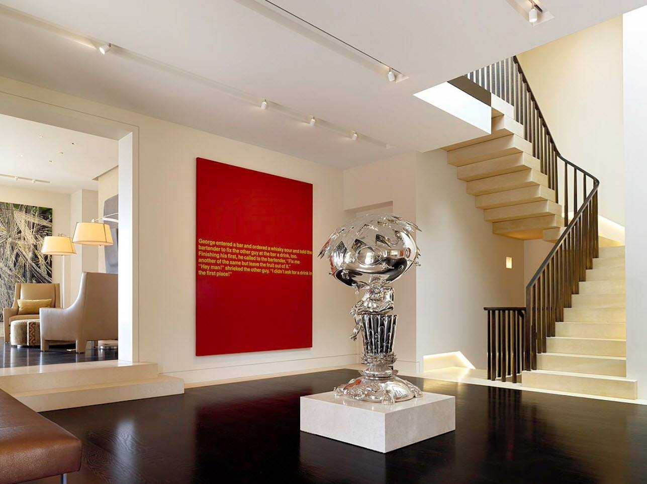 В таком интерьере не стоит делать ярких цветовых акцентов: дополнением могут стать серебряные статуэтки, вазы из прозрачного стекла, зеркала в посеребренных рамах, графические изображения на постерах и картинах.
