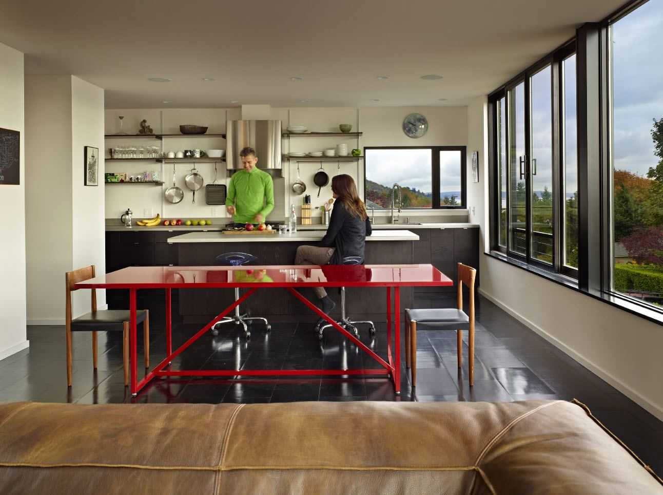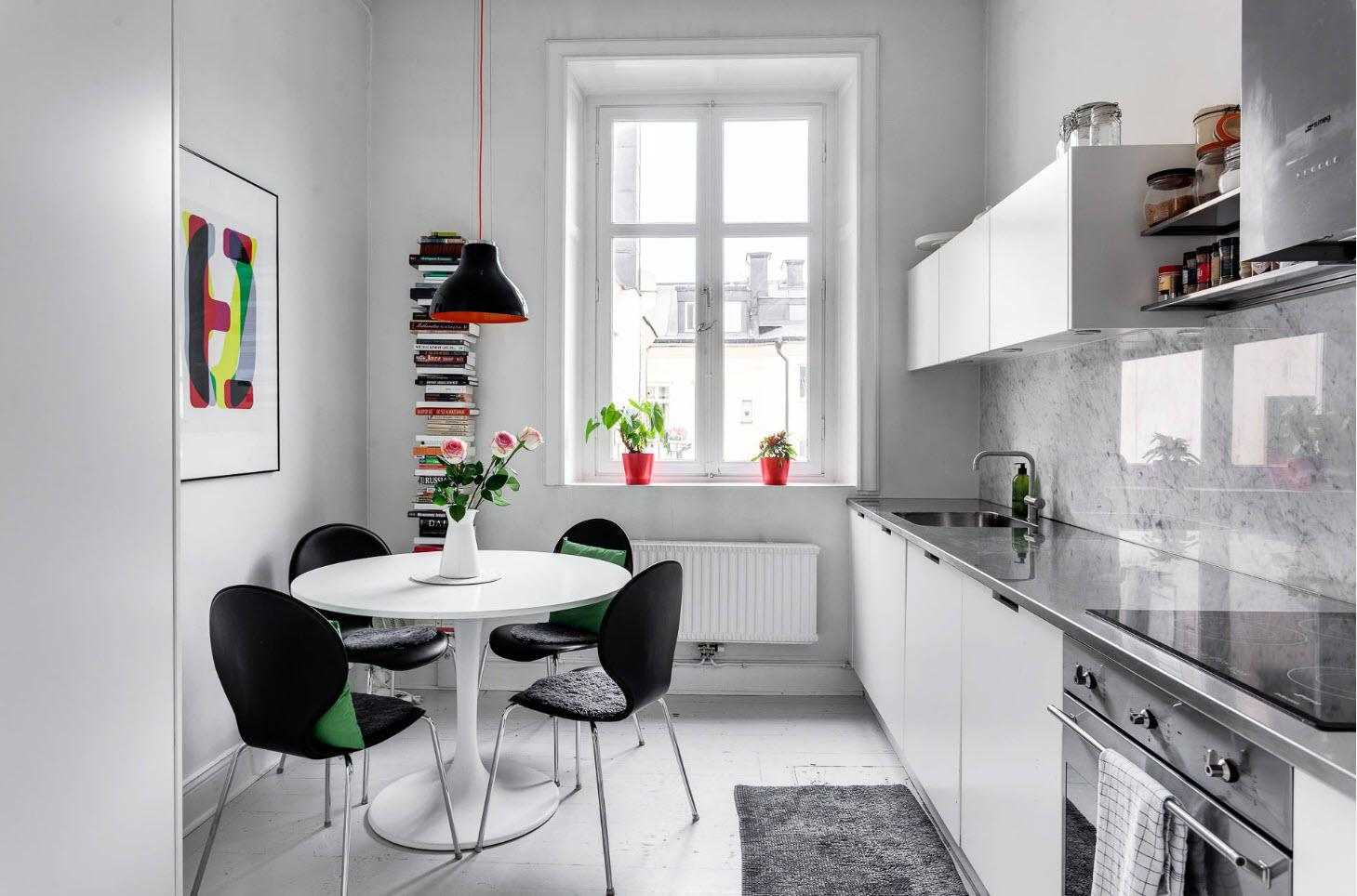 Центральную часть занимает гостиная, совмещенная с кухней и столовой. Благодаря открытию жилого помещения к кухонной зоне комната приобретает вместительность, и целое кажется намного большим. Кроме того, вездесущий белый оптически увеличивает небольшое пространство и идеально подходит в качестве фона для более сильных цветовых акцентов. Так, белый хорошо сочетается с деталями из красного. Мебель в этом случае может быть черного цвета.