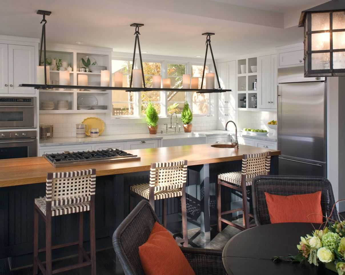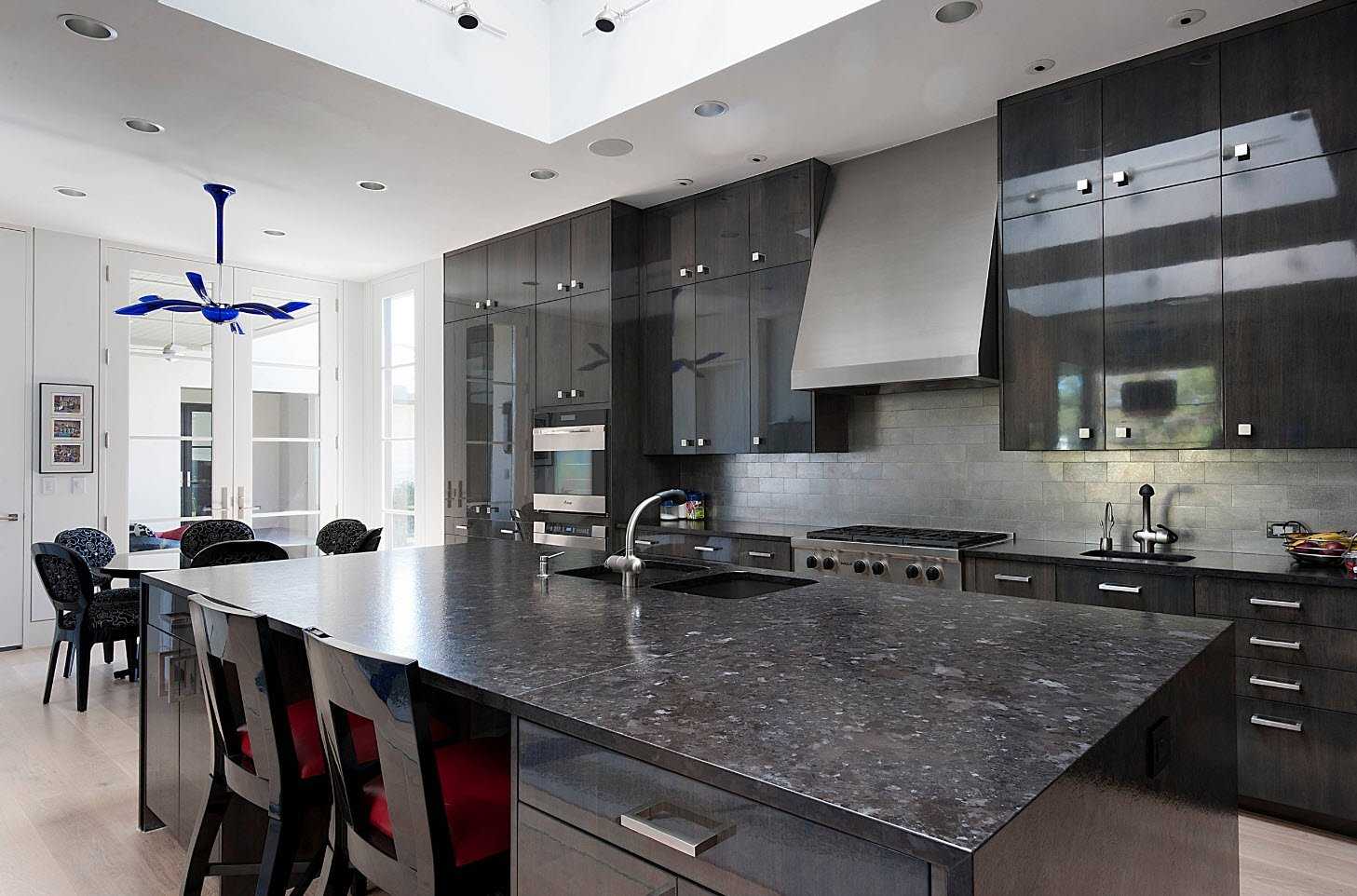 В основе концепции дизайна кухни лежит комфорт и удобство. Черный цвет кухонной мебели часто встречается в современных дизайнерских проектах. Кухонный гарнитур из дуба выглядит массивно и требует разбавления светлыми пятнами. Это может быть деревянная столешница, белый кухонный остров или светлые шторы.