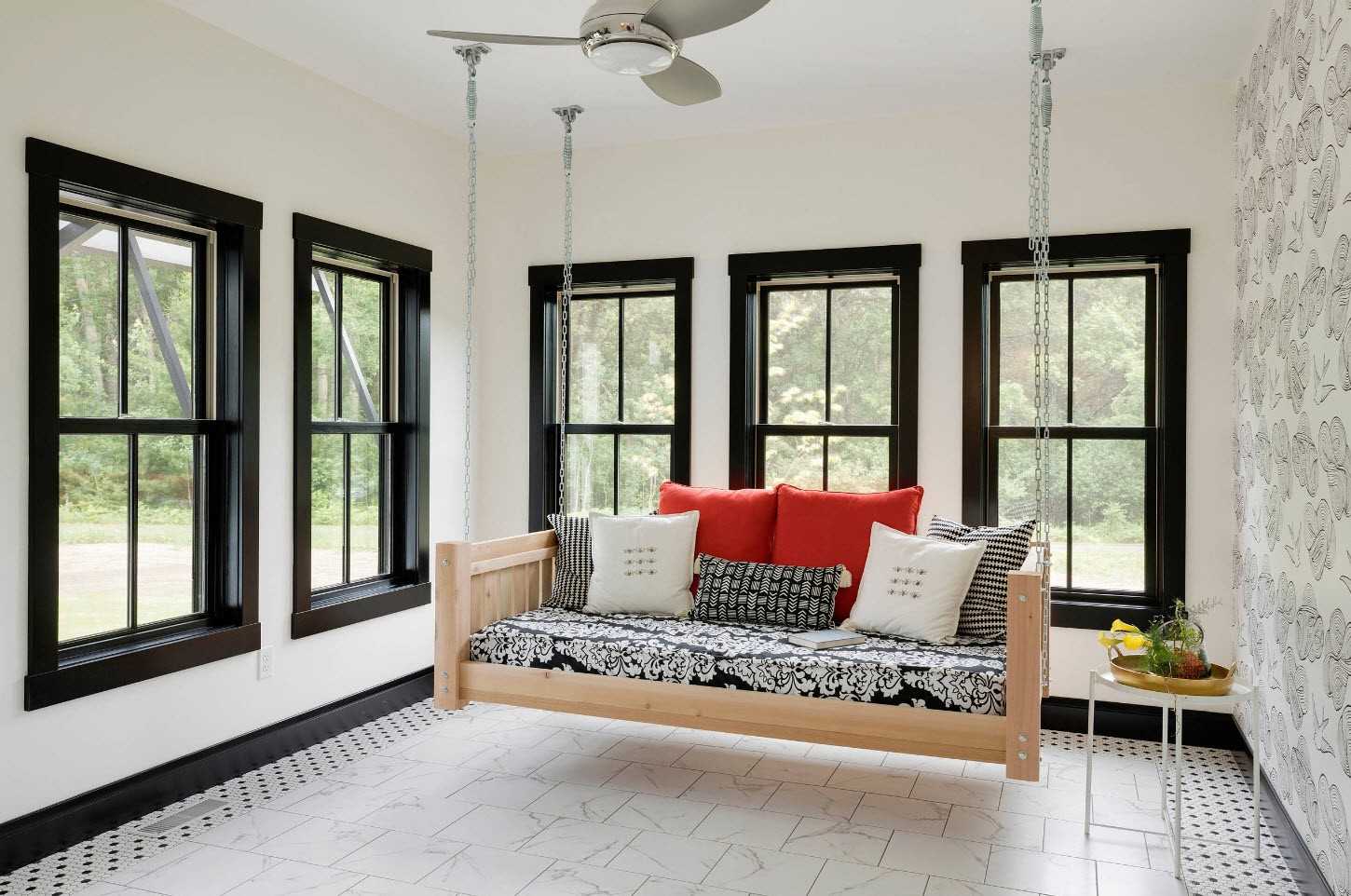 В современном стиле часто используется сочетание черной модульной мебели и декора чистого белого цвета. Черные оконные рамы с белыми шторами, черный диван, и совпадающий по цвету глянцевый книжный шкаф из дуба, на фоне белых обоев и белоснежного полового покрытия будут выглядеть невероятно гармонично.