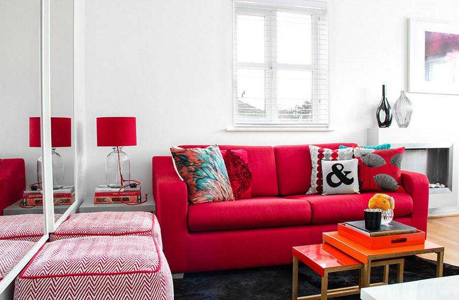 Диван красного цвета в дизайне интерьера
