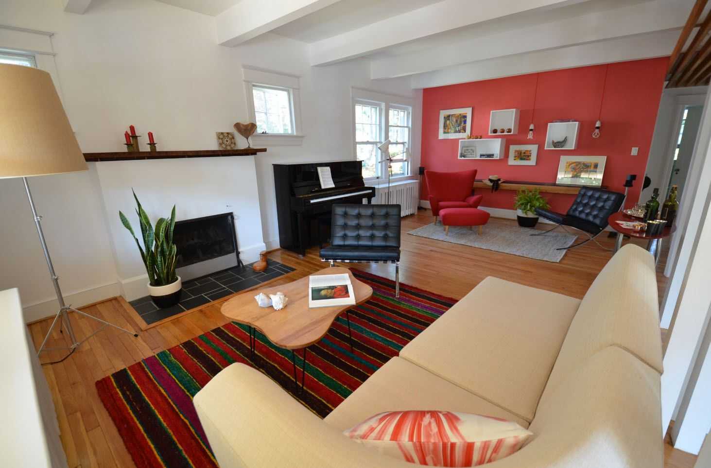 - шаблон оформления интерьера , где красный диван является главенствующим из цветов палитры ;