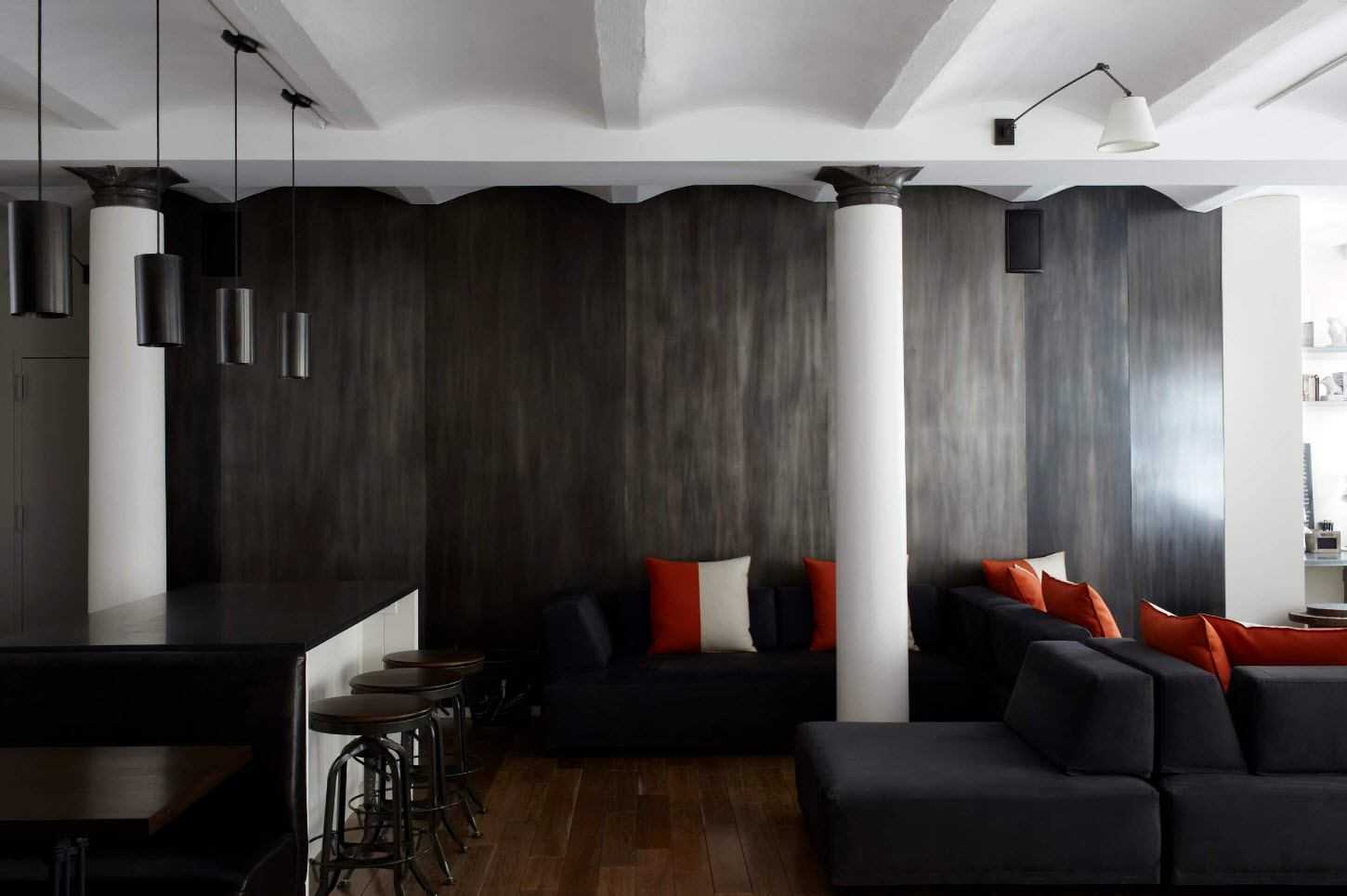 Можно создать монохромный интерьер, используя только три цвета: белый, черный и серый. В этом случае серый диван идеально уравновешивает контрастные ахроматические цвета и привносит в комнату налет исторической роскоши.