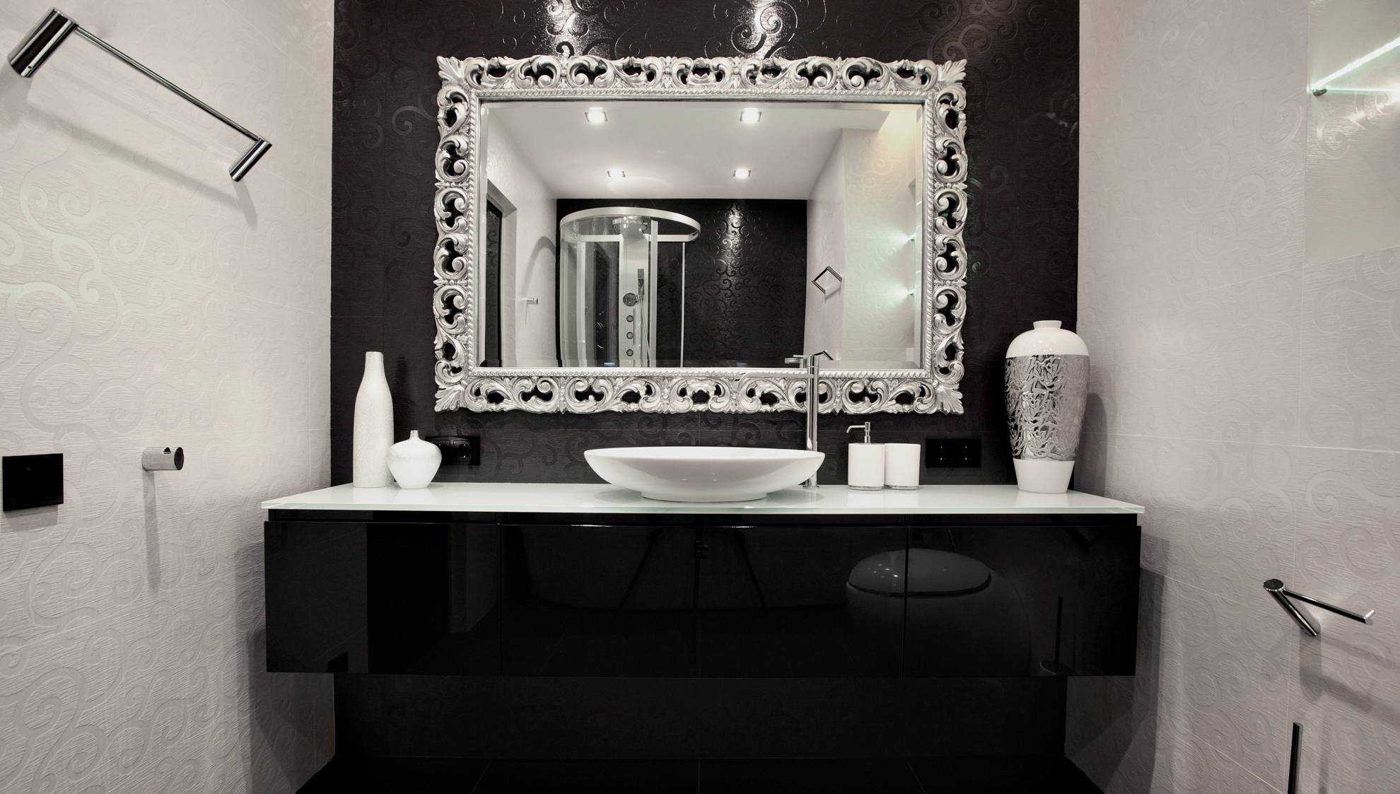 Черная мебель в интерьере в сочетании с белой гаммой позволяет создать шикарный и стильный дизайн квартиры. Монохромный контрастный интерьер стал классикой жанра — используя всего лишь два цвета, слегка разбавленных блеском зеркальных поверхностей – лучшее решение для ванной.