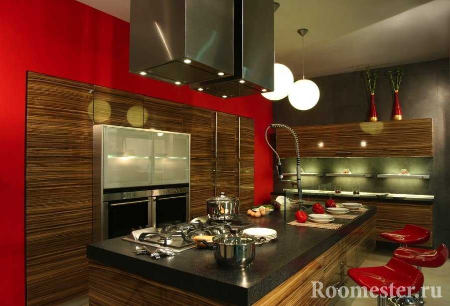 Яркость красного цвета может зависеть не только от конкретного оттенка, но и от типа материала. Например, красный глянцевый пластик для кухонного гарнитура будет выглядеть более вызывающе, чем матовые поверхности из МДФ того же оттенка. Спокойные красные тона выглядят сдержанно, поэтому незаменимы для создания элегантных, богатых интерьеров гостиной, кабинета.