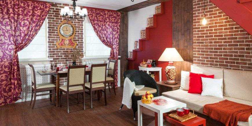 Можно создать за счет красного кирпича или окрашенной кирпичной стены в красный или белый цвет. Здесь будет уместно сочетание белого, серого, черного и красного в разных пропорциях. Например, большой диван или кровать можно сделать красной, а стены серыми, или наоборот. Пол лучше сделать деревянным, стены матовыми коралловыми.