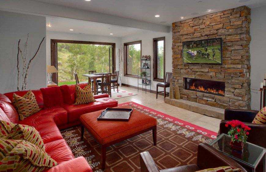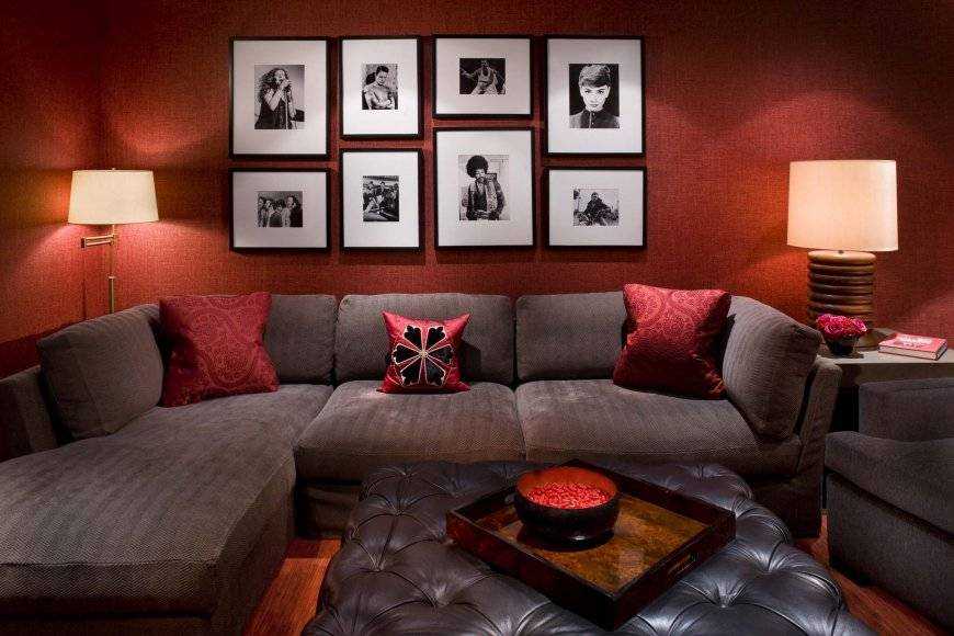 Кожаный диван белого, черного или красного цвета идеально вольется в дизайн красной гостиной. Именно аксессуары оживляют интерьер.