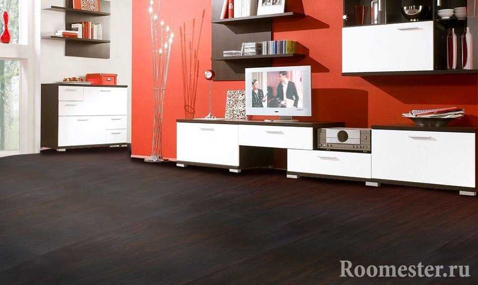 В дизайне красной гостиной можно использовать множество материалов. Прекрасный вариант оформления пола – ламинат или паркетная доска с натуральной древесины.