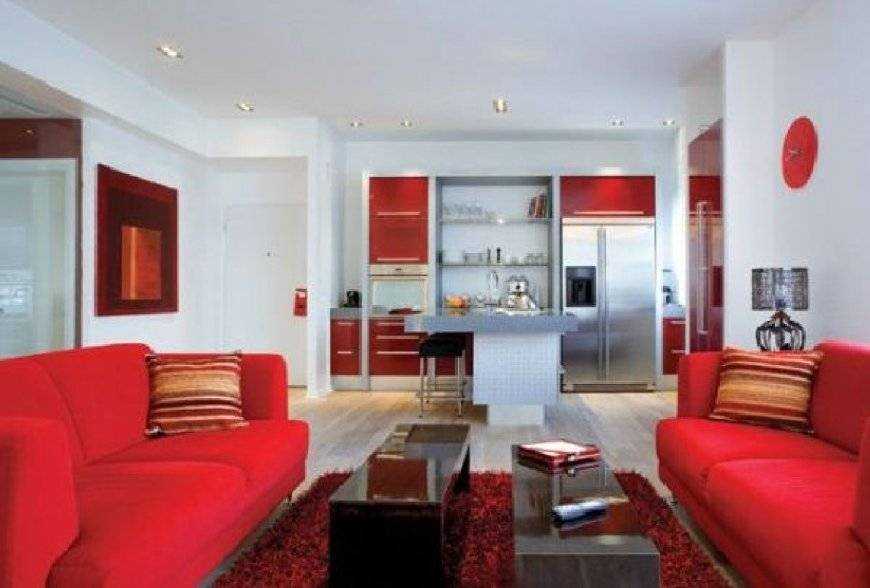 Красный гарнитур или мягкая мебель сочетается с серыми или черными стенами, придавая интерьеру жизнерадостности и легкой агрессивности. А вот светлые обои – это, в первую очередь, отличный фон для яркой красной мебели, которую нужно будет поддержать парочкой таких же аксессуаров. И наоборот, темно-серый диван идеально подойдет к темным полам и красным стенам. Всегда изысканно выглядит и классическое сочетание красных и черных предметов обстановки.