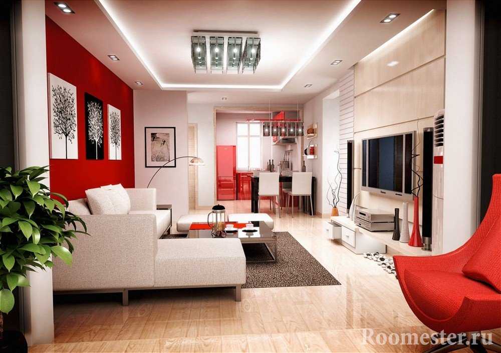 Красная люстра на белом потолке будет выглядеть оригинально. Интерьер можно дополнить оригинальными небольшими светильниками или большим напольным светильником, в красных или белых тонах.