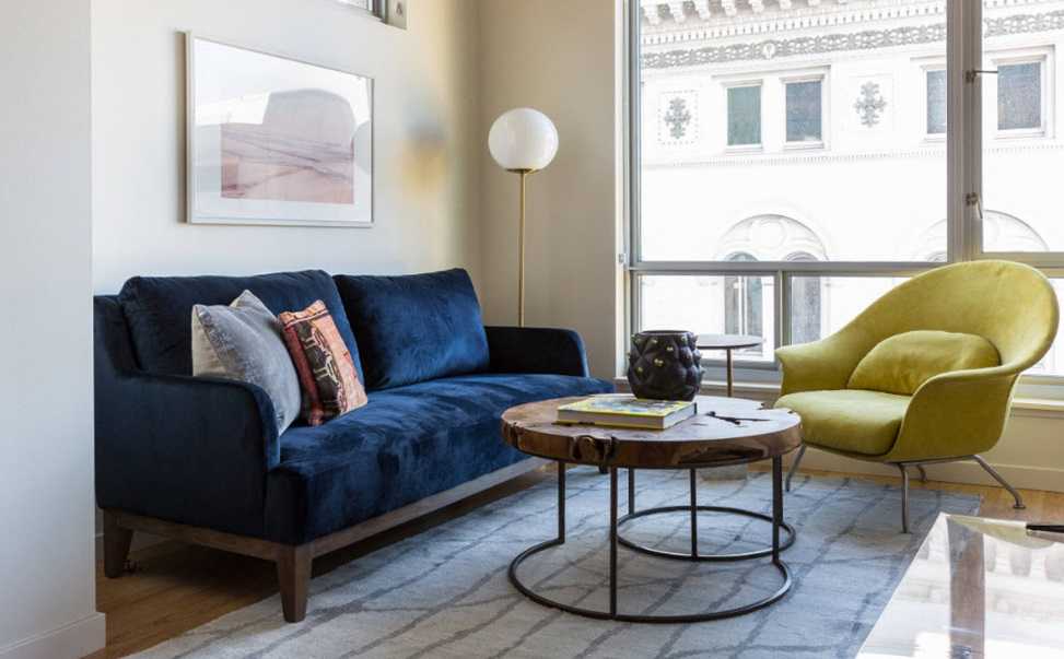 - Синий. Популярен при выборе цвета обивки, особенно в морских интерьерах, успокаивает, расслабляет, умиротворяет. Приветствуется сочетание синего цвета с теплыми тонами.