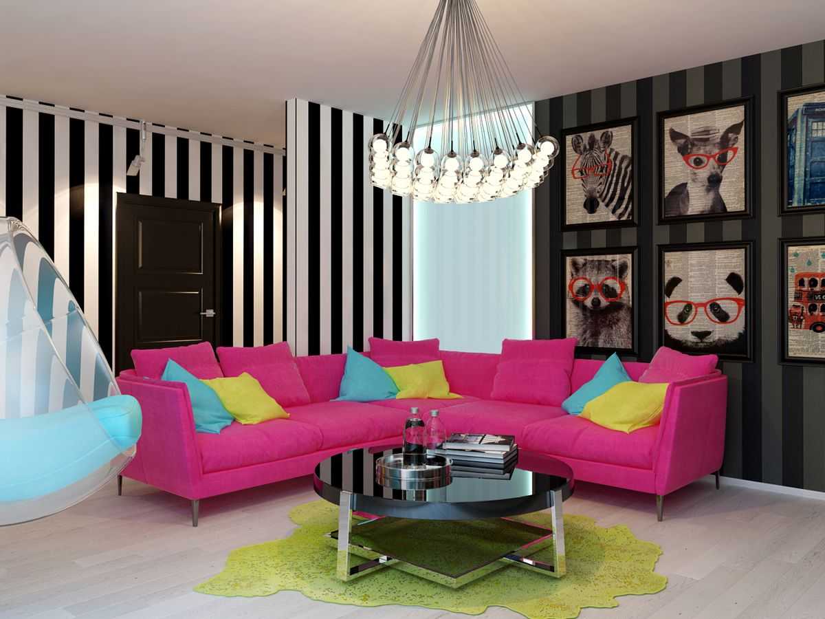В этом случае цвет дивана и стен яркие. Для усиления эффекта они могут быть контрастных цветов. Желтый и синий, зеленый и красный.Такая схема годится для помещений, предполагающих активные действия. Как подбирать контрастные цвета читайте в конце статьи.