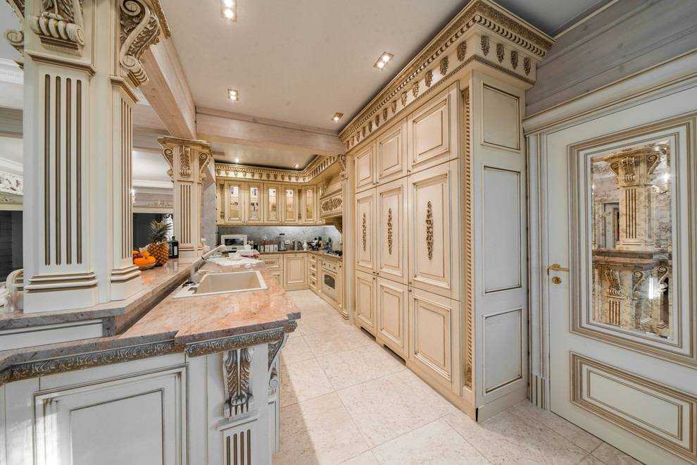 Для кухни стоит выбирать отделку стен краской или штукатуркой, для пола подойдет керамическая плитка под паркет или мрамор. Наиболее привлекательно смотрятся белые кухни с золотой отделкой. Кухонный гарнитур должен быть массивным из дуба, каштана, ясеня, украшенным резьбой и покрытый лаком. Шкафы могут быть со стеклянными вставками.