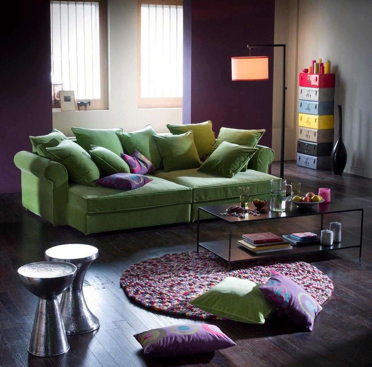 Диван с подушками зеленого и фиолетового цвета можно поставить в гостиной, стены которой оформлены в пурпурном или фиолетовом оттенке, а пол покрыт темным ламинатом. Чтобы помещение не казалось слишком затемненным, его следует дополнить разноцветным напольным ковром круглой формы, стеклянным столиком и крупным светильником с желтым плафоном.