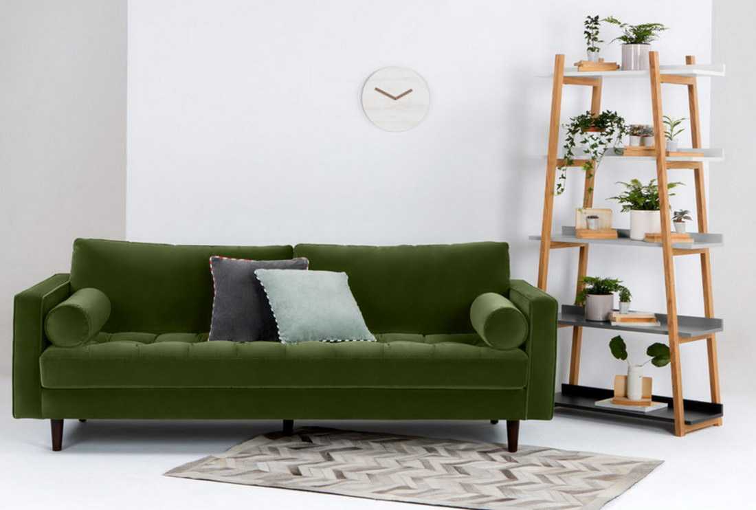 - Глубокий зелёный цвет дивана (цвет папоротника или фисташек) ассоциируется с натуральностью. Он хорошо будет смотреться на фоне натуральных деревянных полов;