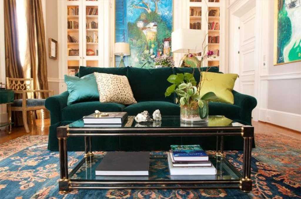 Сочетание зелёного дивана с элементами интерьера других цветов