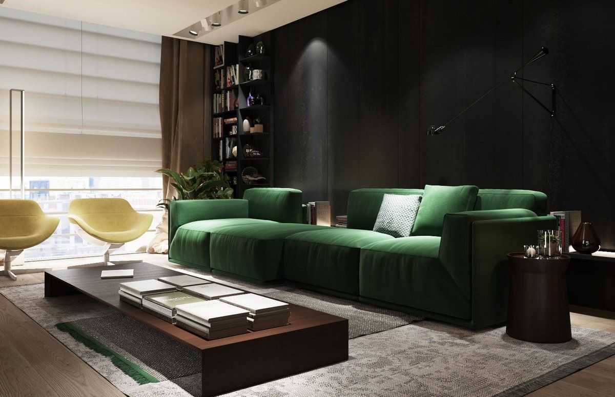 Угловой диван темно-зеленого оттенка будет потрясающе смотреться на фоне черных стен, белого потолка и темного ламината, украшенного большим квадратным ковром с монохромными принтами. Если мебель располагается на фоне окна, то для него следует подобрать легкие белые шторы. На стене за диваном будет эффектно смотреться большая черно-белая картина, а возле боковых деталей мебели – деревянные тумбы с темными светильниками.