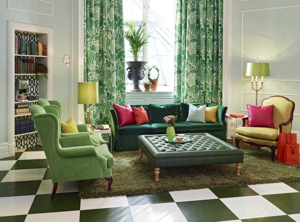 С яркими оттенками лучше сочетаются гладкие ткани, кожа, а также материи с необычным фактурным узором. Темная зеленая обивка может быть сделана из фактурных тканей, искусственной или натуральной кожи. Светлые тона лучше смотрятся на материи с мягкой или выраженной ребристой фактурой, хуже – на гладких тканях.