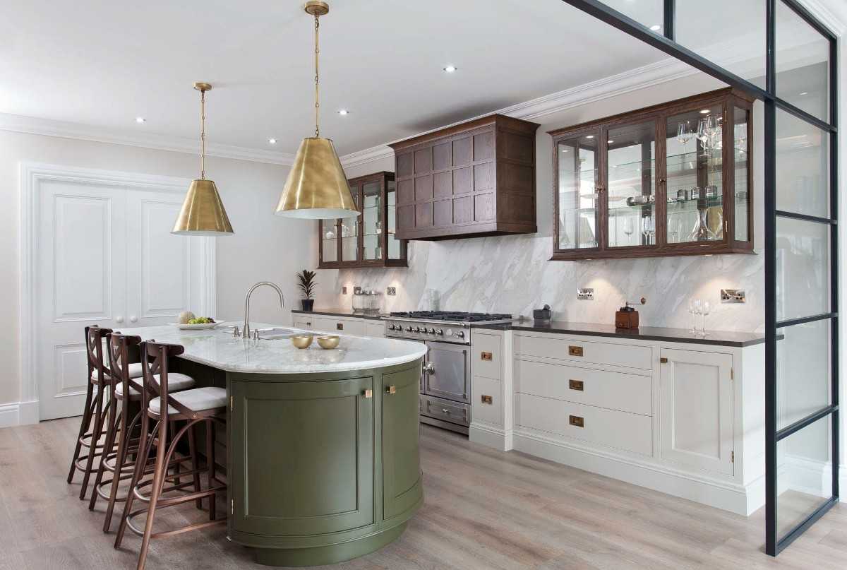 Гарнитур в классическом, как и в любом ретро-стиле, обычно достаточно прост и геометричен. Без лишнего декора и ажура фасады мебели будут украшены накладками, резьбой, стеклянными вставками. Можно сделать верх более светлым, а низ – темным, тогда помещение будет казаться менее загроможденным. Аналогичным образом работает стекло в верхних фасадах; светлый фартук, столешница, обеденная зона и не менее светлая гостиная.