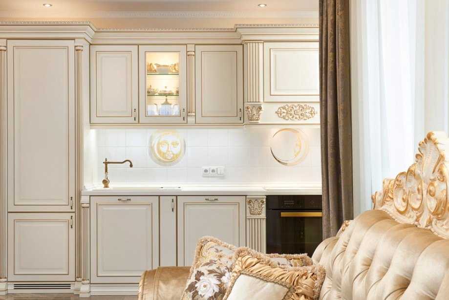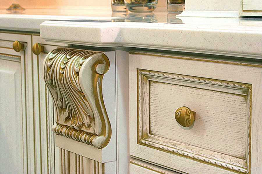 Выбор оттенка зависит от цвета фасада и дизайна кухонного гарнитура. В любом салоне, где можно заказать кухню в классическом стиле, вам предложат золотую или серебряную патину. Но вы можете выбрать и другие оттенки — белую, черную, коричневую, серую, желтую и пр.