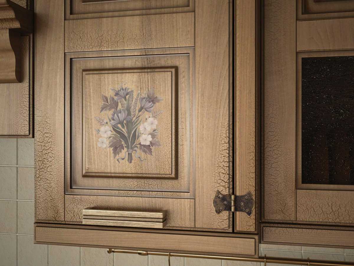 При заказе кухни в стиле прованс или шебби-шик вы можете выбрать фасады с эффектом кракле или кракелюр. Такие дверцы покрывают специальным кракелюрным лаком. При высыхании он покрывается мелкими трещинками — так же, как старая краска. Затем в них бережно, чтобы не повредить хрупкий эффект кракелюра, втирают контрастную патину, а в конце защищают финишным слоем лака.