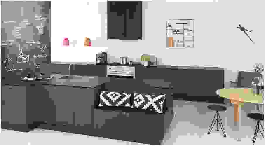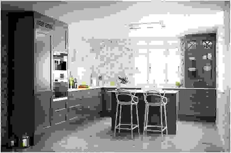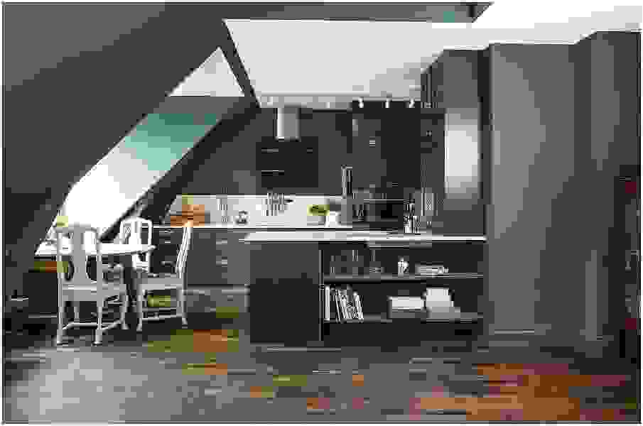 Минимализм и хай-тек технологичны. Здесь актуальны холодные оттенки серого. Это и светлые пепельные тона, и темные цвета палитры (асфальт, графит). Такие гарнитуры лаконичны, не имеют украшений, а часто и фурнитуры. Вместо ручек, используется система с нажимным механизмом. Линии чистые и прямые, поверхности обычно глянцевые.