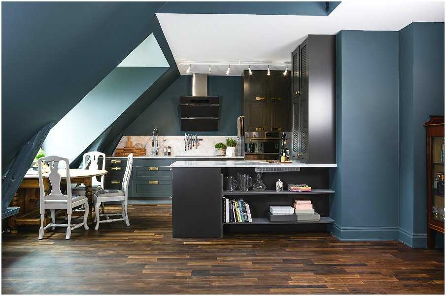 Синий обычный цвет для ванной комнаты, но в кухне его используют нечасто.