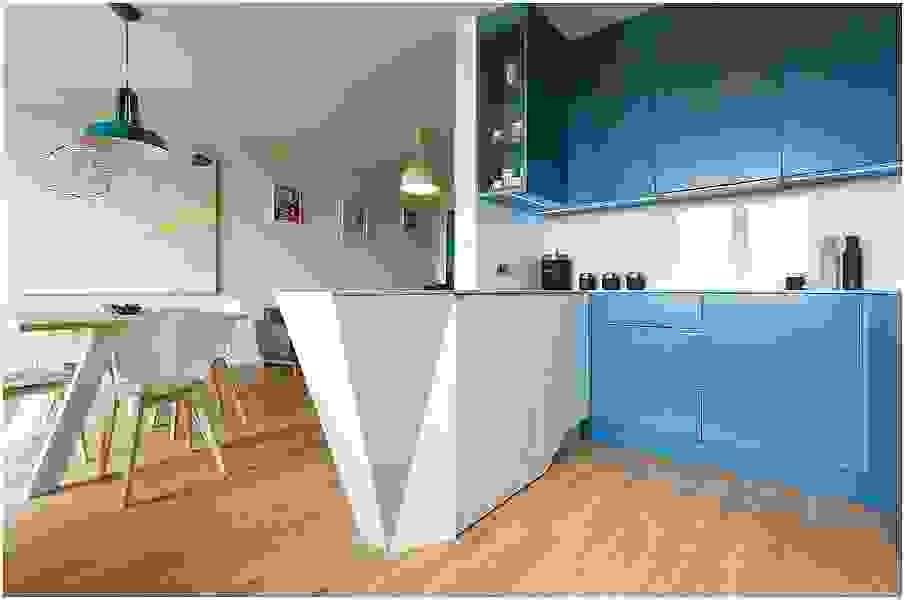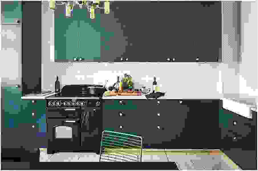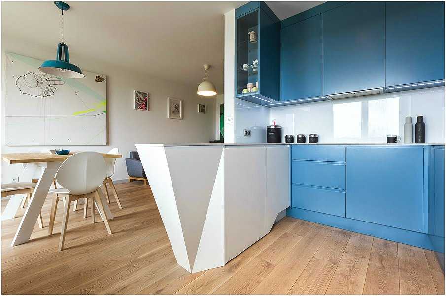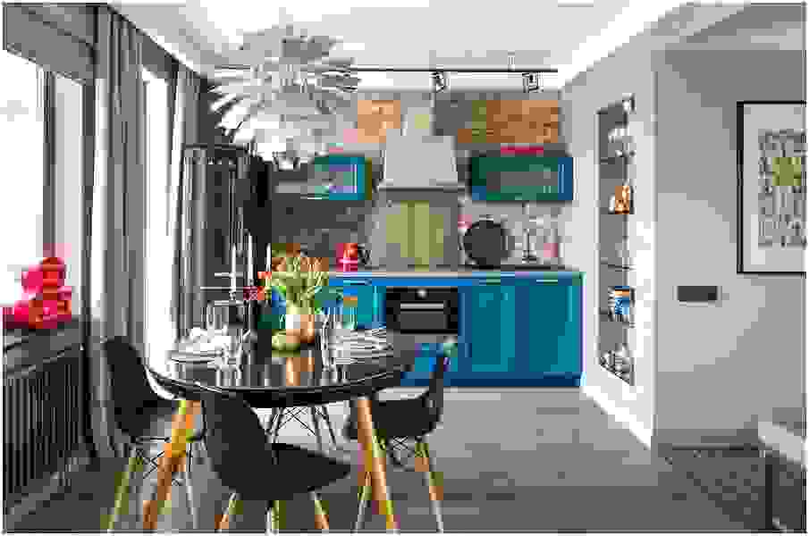 Стильный минималистичный интерьер с синим кухонным гарнитуром