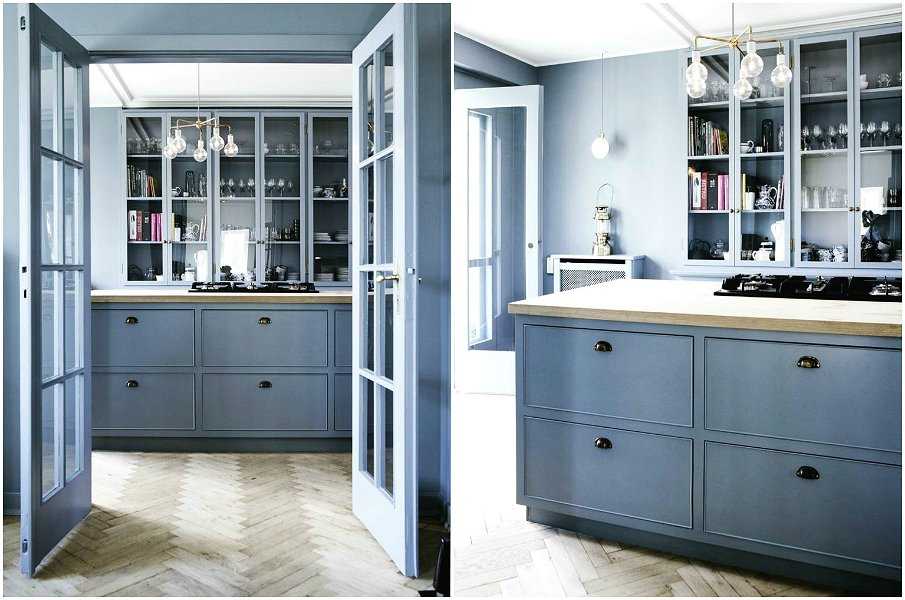 Светло-синий интерьер кухни выглядит очень элегантно и свежо